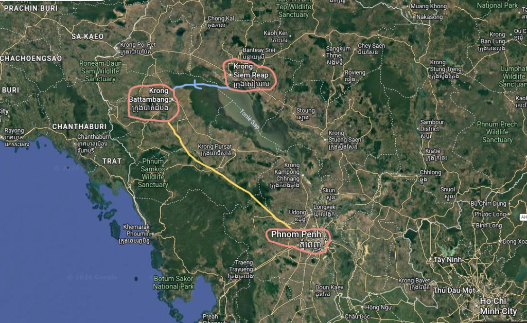The Google Maps above show the route. We flew into Siem Reap, toured the Angkor Archeological Site, then travelled by boat to Battambang, then by train to Phnom Penh.