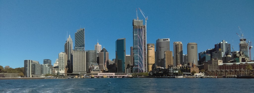 Pulling away from Circular Quay, made small by the skyscrapers behind them.