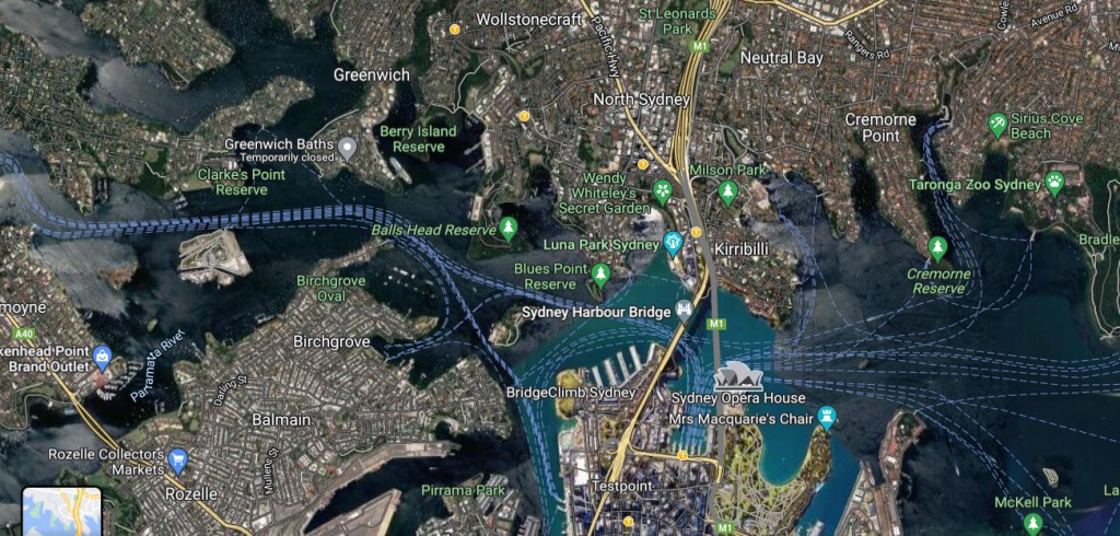 The above map is some of the routes of Sydney Ferries. The ferries all do a round trip from Circular Quay (at below centre, just below the Sydney Opera House). My route, chosen a random, took me to Cockatoo Island (centre right, below the Clarke’s Point Reserve).