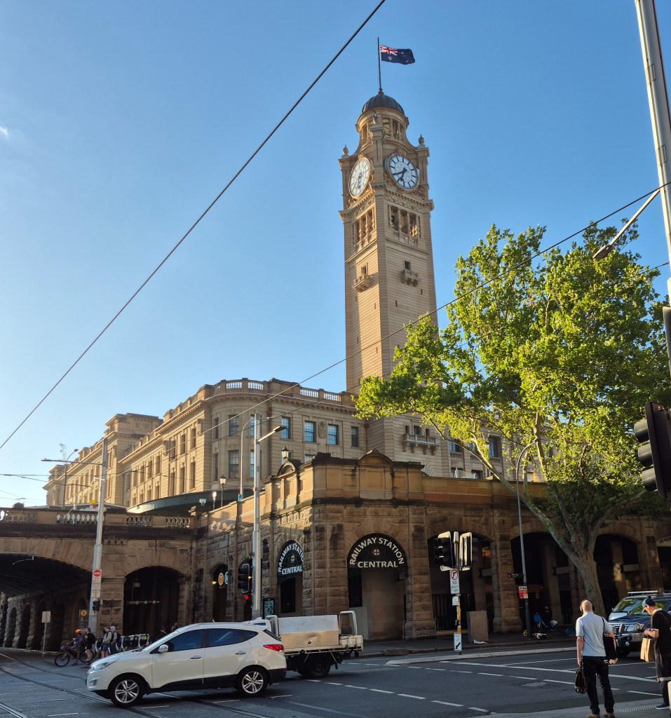 One level up via the escalator. The entrance to Central Station is the ornate entrance-way to the right. We arrived as a tram (technically, light rail) was just departing.