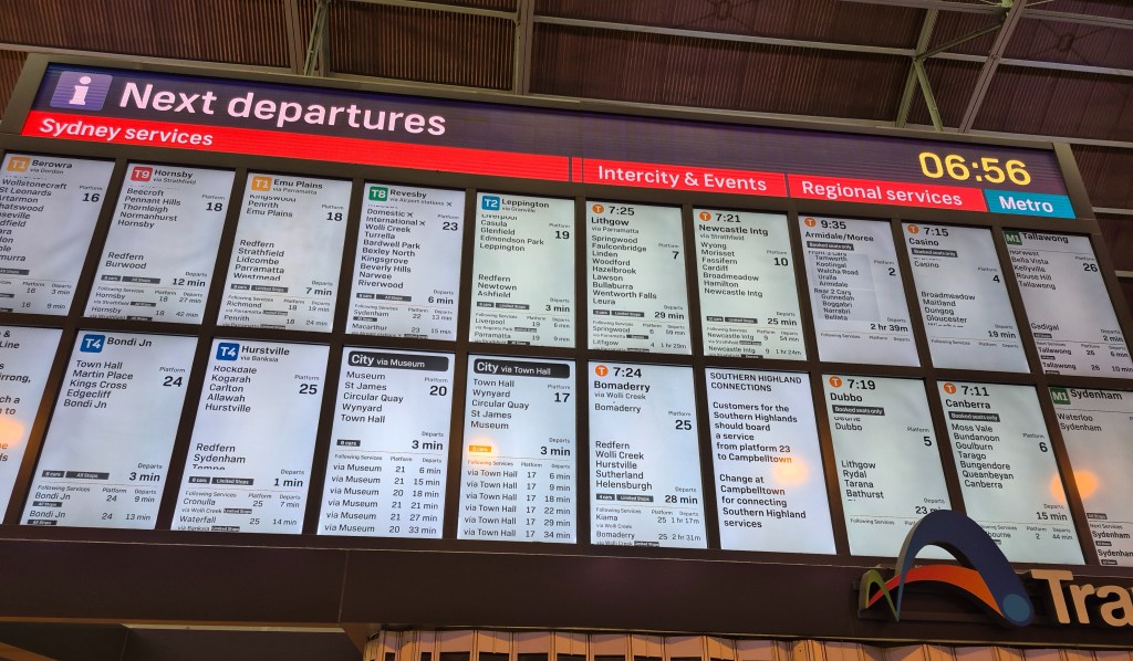 A close-up view of the departures noticeboard. Our train was scheduled to depart at 7:19am, terminating at Dubbo (lower screens, three from right).
