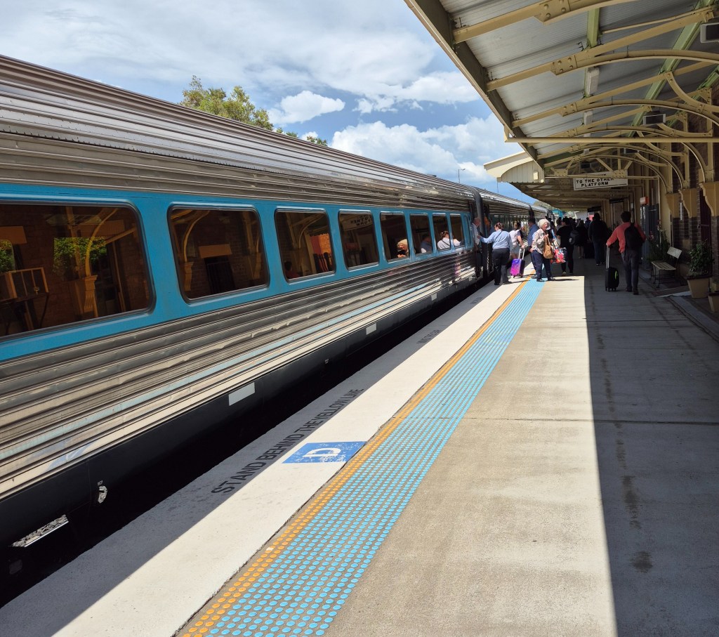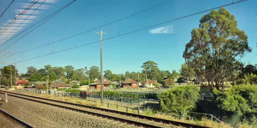 Above is the map. According to 12Go, “Travelling by train, the distance from Bathurst to Sydney is 109 miles” or 175 kilometers. Going by train takes 3 1/2 hours. First we go through Sydney to Penrith, then go up over the Blue Mountains to Lithgow, then finally go through the Western tablelands to Bathurst.