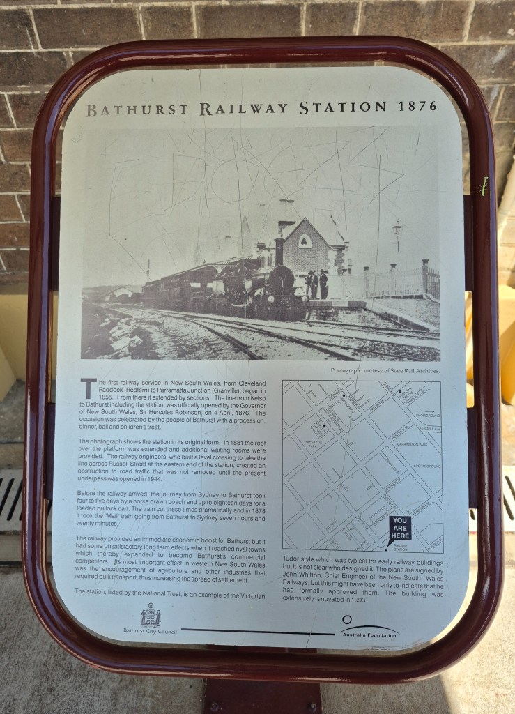 A plaque in Bathurst Railway Station. It reads in part, “The line from Kelso to Bathurst including the station, was officially opened by the Governor of New South Wales, Sir Hercules Robinson, on 4 April, 1876. The occasion was celebrated by the people of Bathurst with a procession, dinner, ball and children’s treat.” At that time, New South Wales was a colony of Britain, not yet a State in the future Australia.