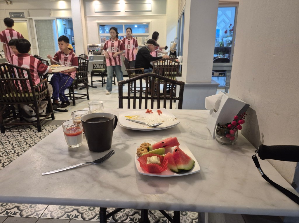 At the coffeeshop near my hotel, about 8:30am. The temperature was in the mid-20s; it’s the coolest time of the year, and the dry season. There were a few coffeeshops together, but tourists always gathered at one coffeeshop – I don’t know why. The tourists preferred fresh coffee, delicious but expensive, about THB 60 ($AUD 3, NTD 60).