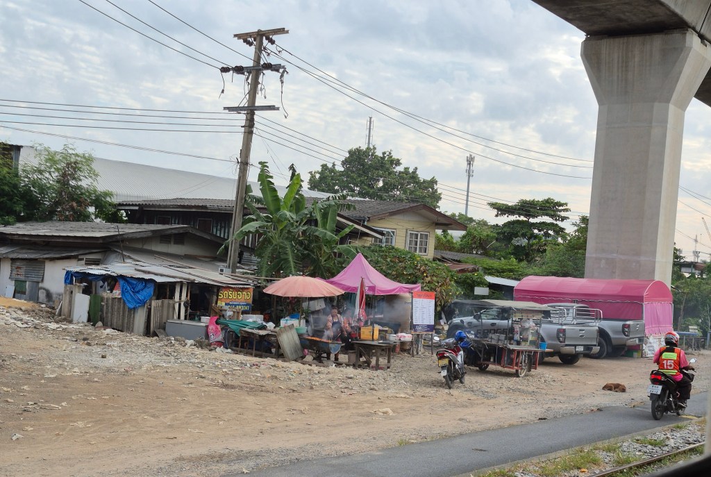 A note about names transliterated from Thai. when I use a Thai word like “สองแถว”, I could transliterate it “songthaew”, or “sawngthaeo”, or “sawngthaew”. The English spelling is different, even though the Thai word is the same. There is a system for rendering Thai words in the Latin alphabet, the Royal Thai General System of Transcription, “the closest method to a standard of transcription for Thai, but its use, even by the government, is inconsistent.”