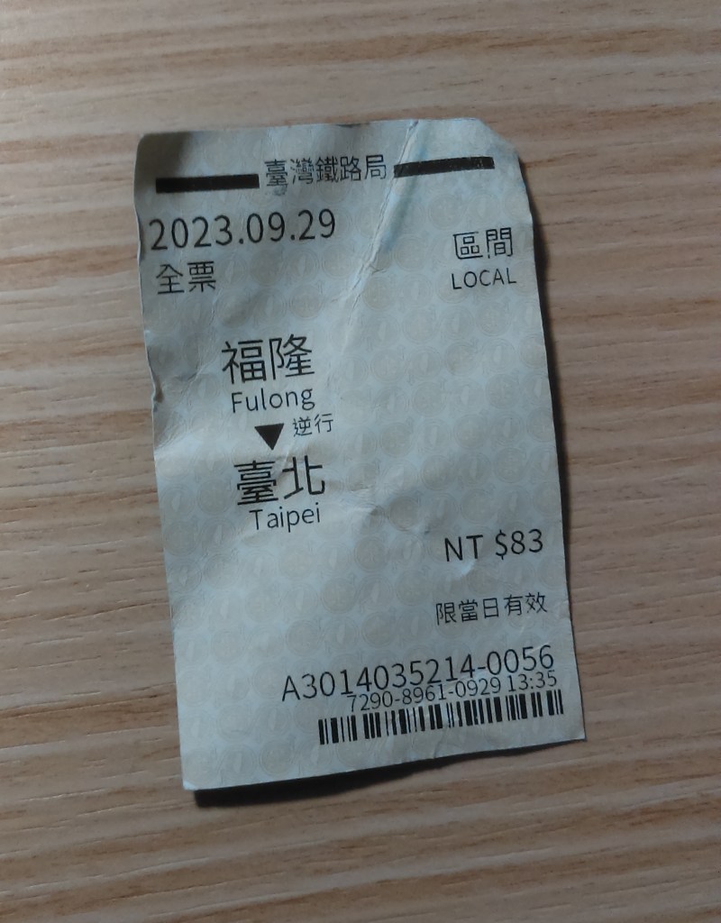 The views were very scenic (above). However, I didn’t realise the intercity express was a non-stop train. The next stop was Yilan, way down south, over an hour away. I passed through Fulong but the intercity express didn’t halt. Worse, the conductor came along and charged me 202元 ($AUD10), around 2½ times the slow train price.