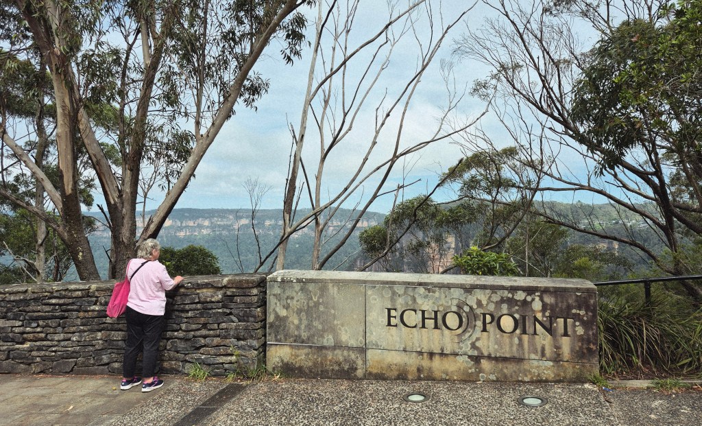 The Dictionary of Sydney said “The question of whether there is, in fact, an echo at Echo Point also remains unsettled, the subject of humorous debate in newspaper letters pages throughout the last century. Some locals claim a ‘cooee’ from the suspended lookout will echo from the left of the Three Sisters while others have suggested it will return, with a long time delay, from the Kanimbla Valley beyond Narrow Neck; though, as local historian Jim Smith observed, ‘two minutes is an awfully long time to the impatient tourist of today.'”