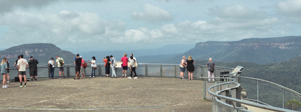 The Dictionary of Sydney said “Situated in Gundungurra and Darug country, and emerging as a major tourist destination in the 1920s, Echo Point now attracts around 1.4 million visitors a year. Because of its popularity (almost ‘loved to death’ in the words of one newspaper) … it is an uncanny site which for almost a century has combined a ‘holiday playground’ … atmosphere with the sublime.”