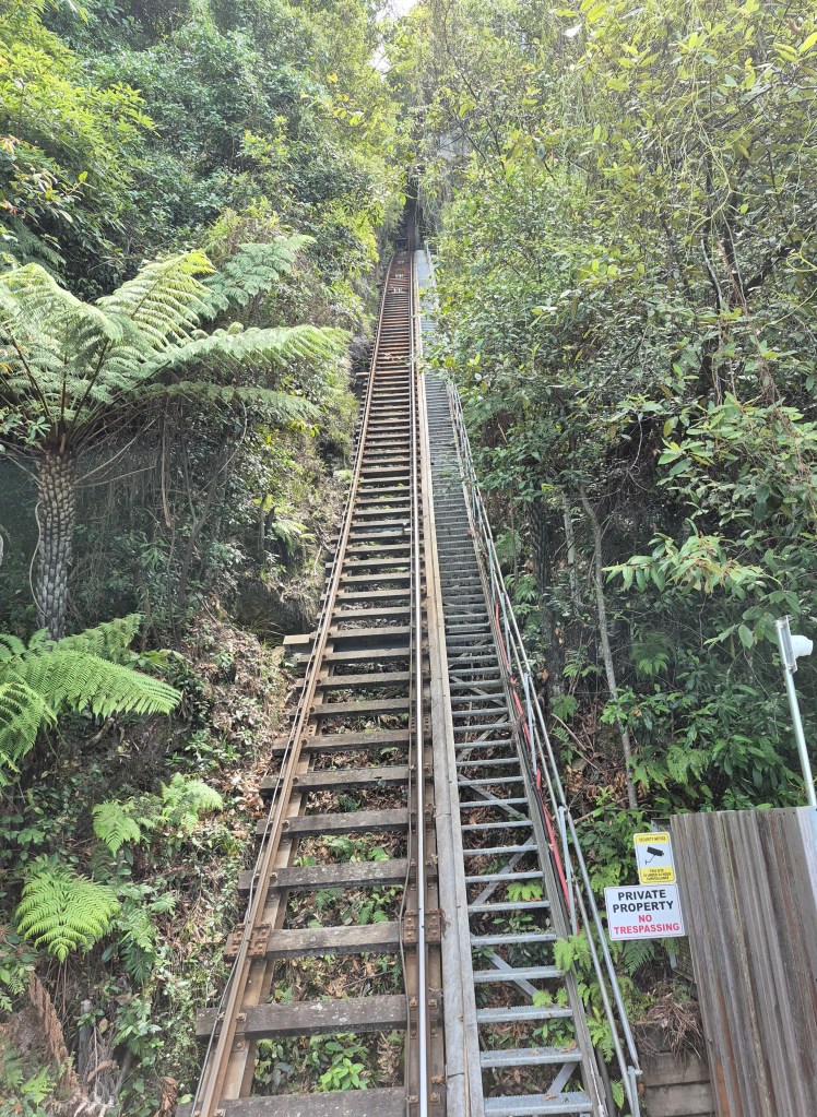 Wikipedia said “The Scenic Railway is an incline railway now used for tourism. The steepest section of track is on an incline of 52 degrees (128% gradient) contained within a total distance of 310 metres (1,020 ft)… It was originally constructed for a coal and oil shale mining operation in the Jamison Valley in the 1880s, in order to haul the coal and shale from the valley floor up to the escarpment above. From 1928 to 1945, it carried coal during the week and passengers at weekends. The coal mine was closed in 1945 after which it remained as a tourist attraction. … The Scenic Railway has been promoted as the world’s steepest passenger railway, but it is technically an inclined lift, not a funicular … In the broader category of cable cars, the Scenic Railway was surpassed in steepness in 2024 by the new Schilthorn cable car in Switzerland, which has a gradient of 159.4%.”