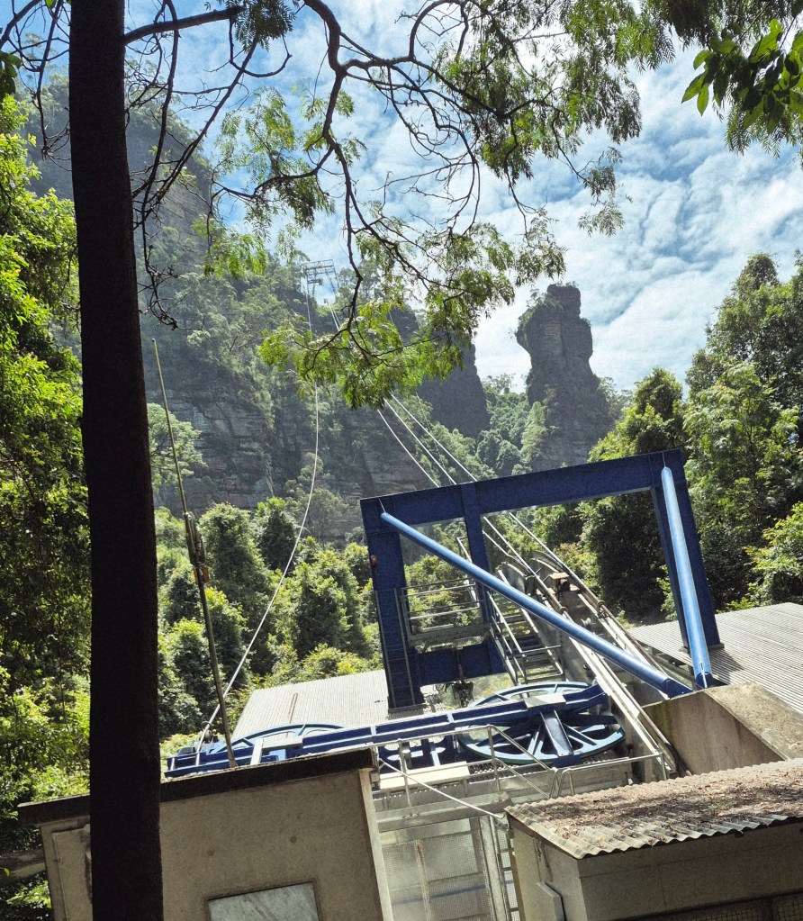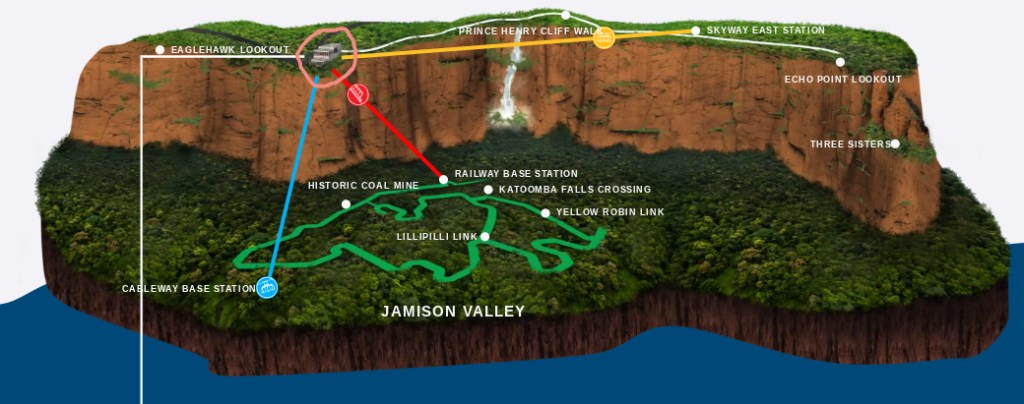 - the Scenic Cableway in blue terminating at the Scenic World building.
