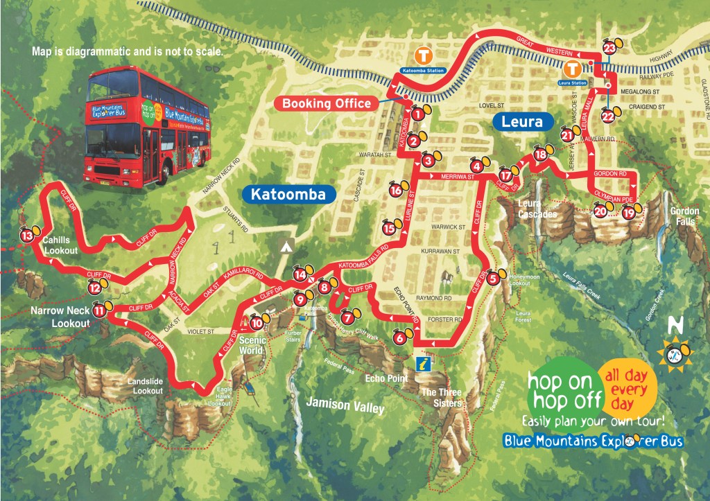 The Blue Mountains Explorer shop gives you a little book with many maps, timetables, and information about the route. Above is one I downloaded giving the Blue Mountains Explorer bus route.