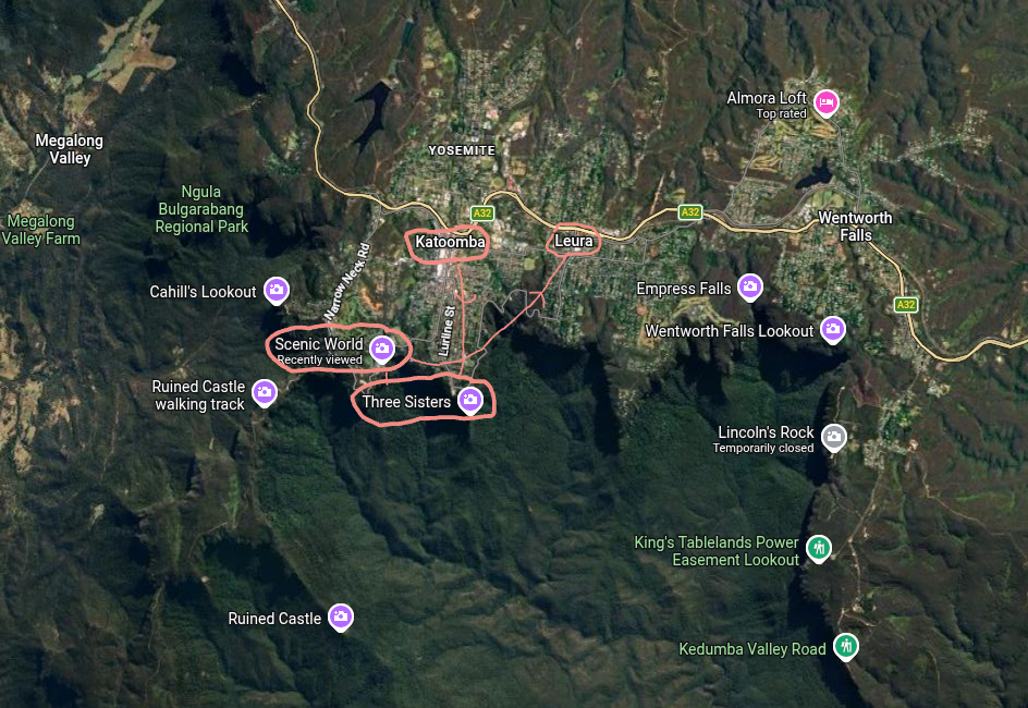 The Google Map above showed our way, from Katoomba Station, to the Three Sisters at Echo Point, then Scenic World, then taking the train home from Leura.