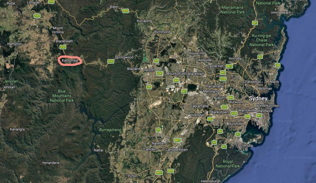 The Google Map above shows Katoomba, around 110 km west of Sydney. The train from Sydney Central Station to Katoomba takes roughly 2 hours.