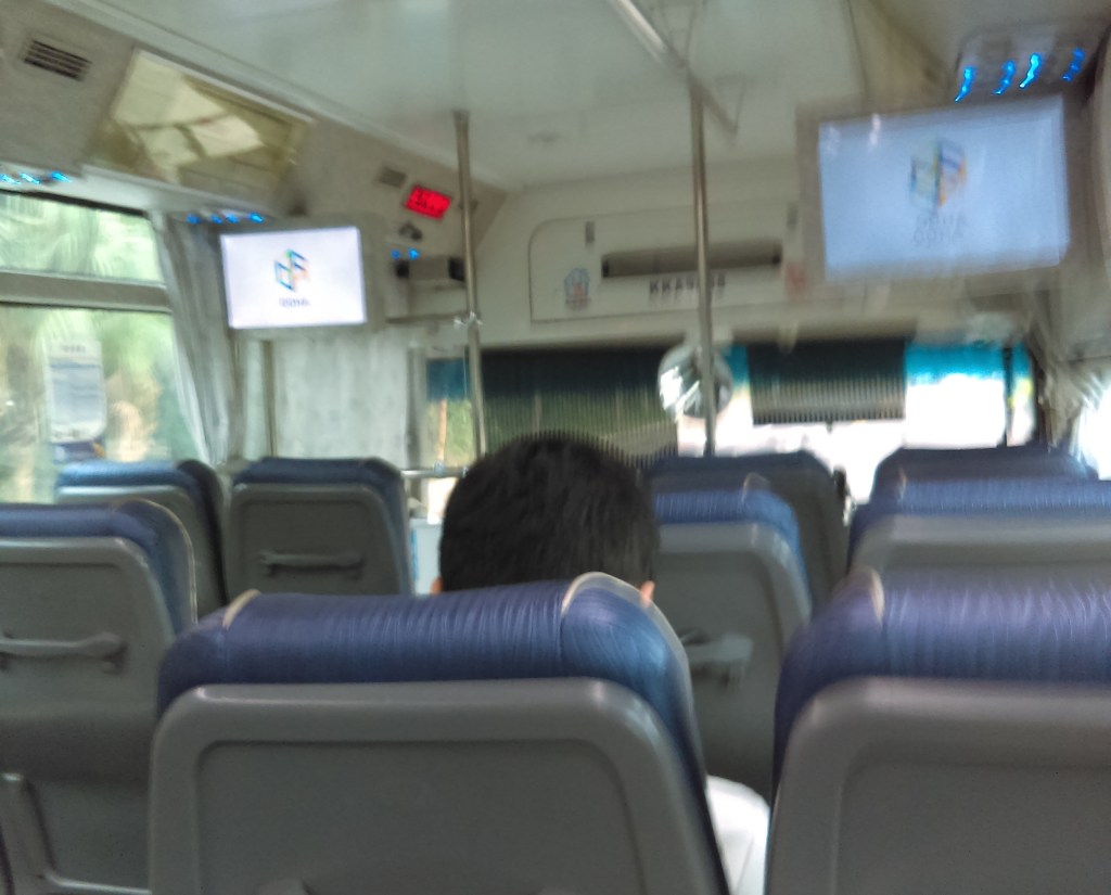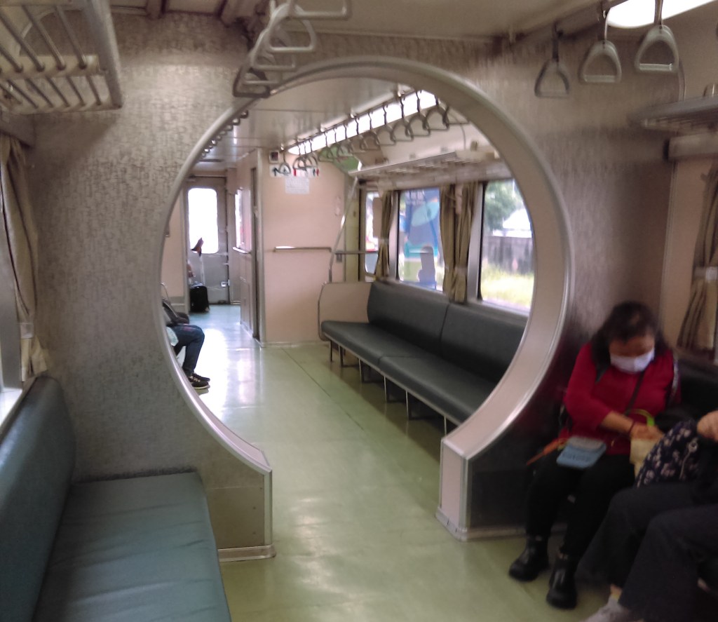 Inside the train. Note the curved bulkheads, and the window at the front of the train next to the driver’s compartment.