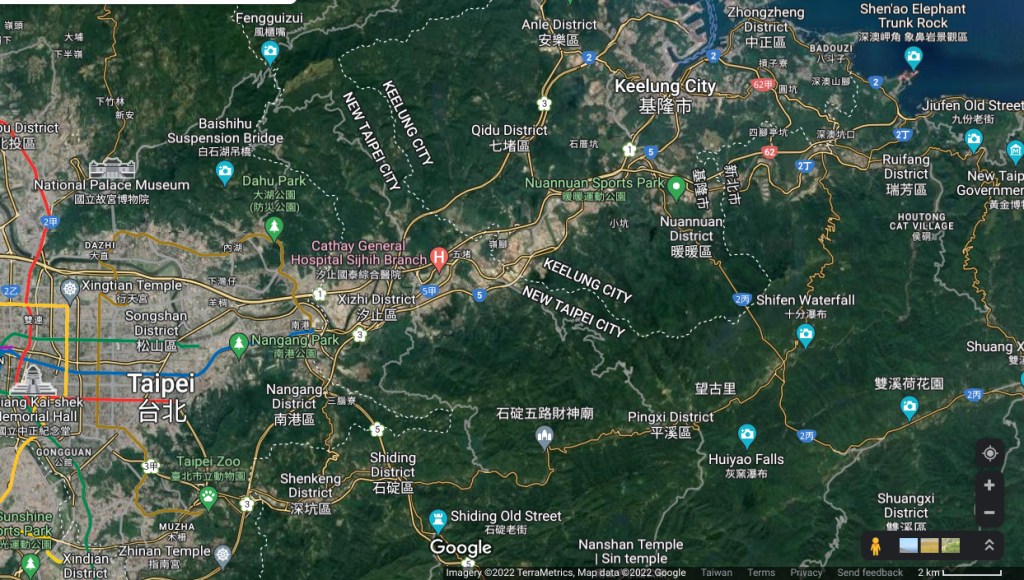 The Google map above gives the distance from Xindian (bottom left) to Badouzi (top right, right of Keelung City); it’s about 40km, about equal to the distance from Northbridge to Blacktown in Sydney.