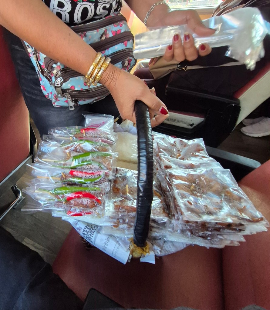 At first there were many vendors on the train, selling water, soft drinks, and snacks (above). A vendor put their basket on the seat beside me; I photographed it, causing the vendor some displeasure.