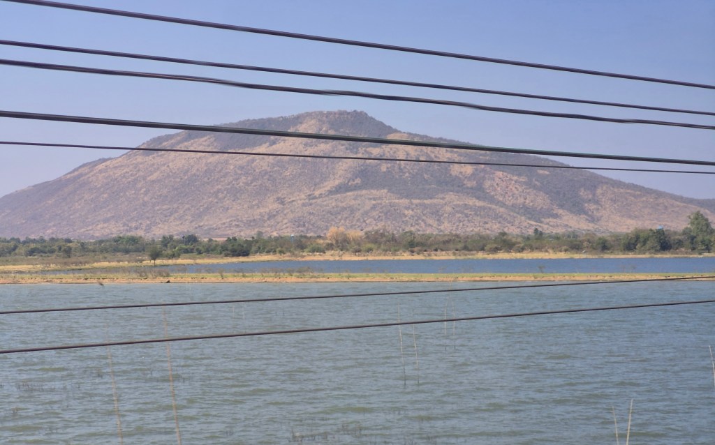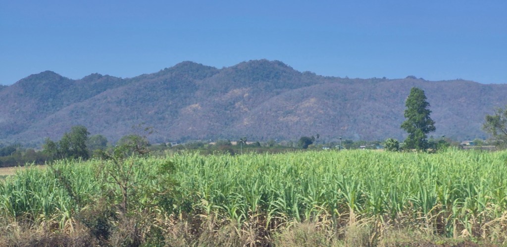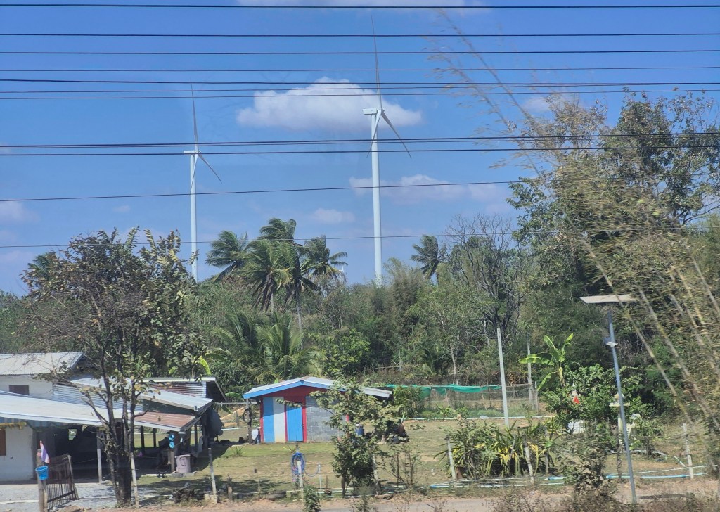 I nodded off in my seat, waking to find we had already passed the Phetchabun Mountains, the primary mountain range bordering the central plains and the Khorat Plateau. We passed some wind turbines (above). The countryside in this place is drier than on the central plains.