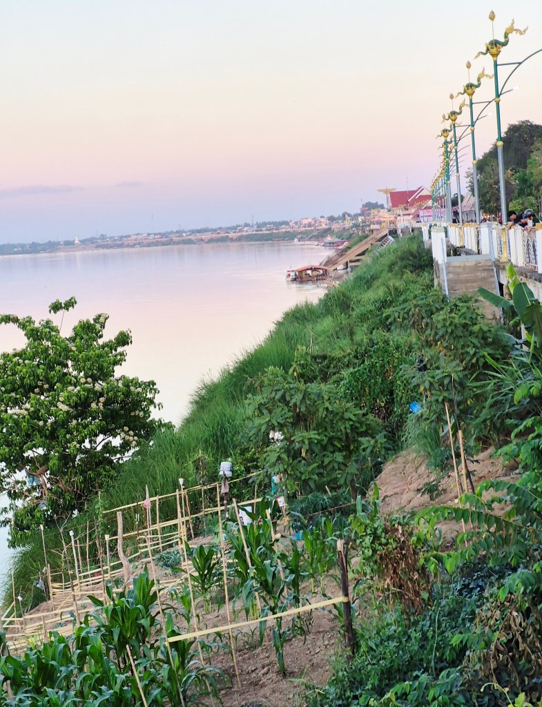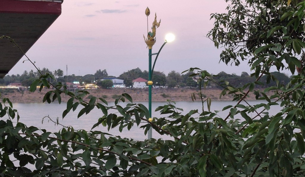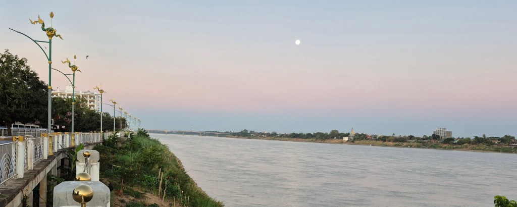 A slightly later photo showing the sunset. The bridge crossing the Mekong River is the First Thai–Lao Friendship Bridge: