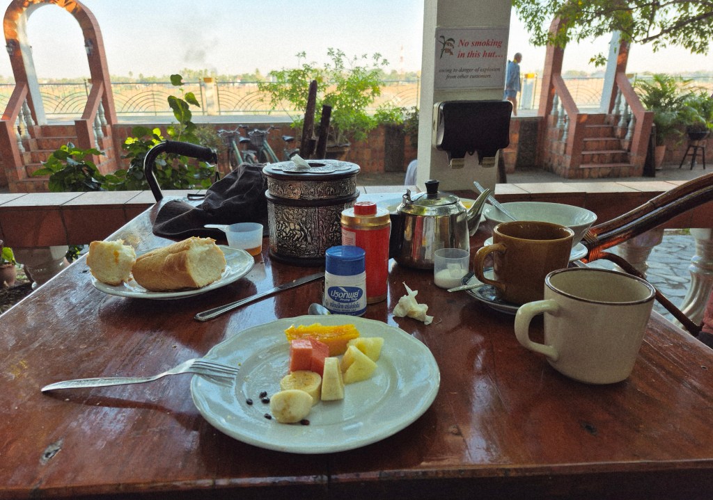 I checked in at The Rim Riverside guest house. My room is set back from the front, up an external flight of steps to the first floor (second floor to the Taiwanese). I took the photo standing on the promenade, the Mekong River behind me.