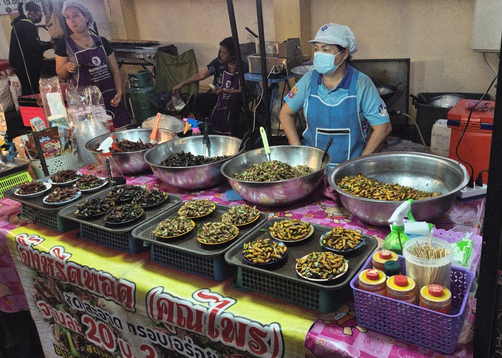 There are stalls selling deep-fried insects (above). On the right there are grubs, on the left deep-fried grasshoppers and crickets.