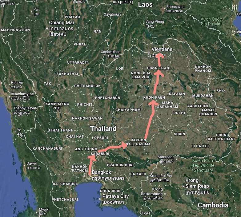 The Google Map above gives an approximation of this train route: from Bangkok through Korat (Nakhon Ratchasima), then Khon Kaen, Udon Thani, and finally to Nong Khai, on the banks of the Mekong River about 16 kilometers from Vientiane, and 624 kilometers from Bangkok. The scheduled duration was almost 9 hours.