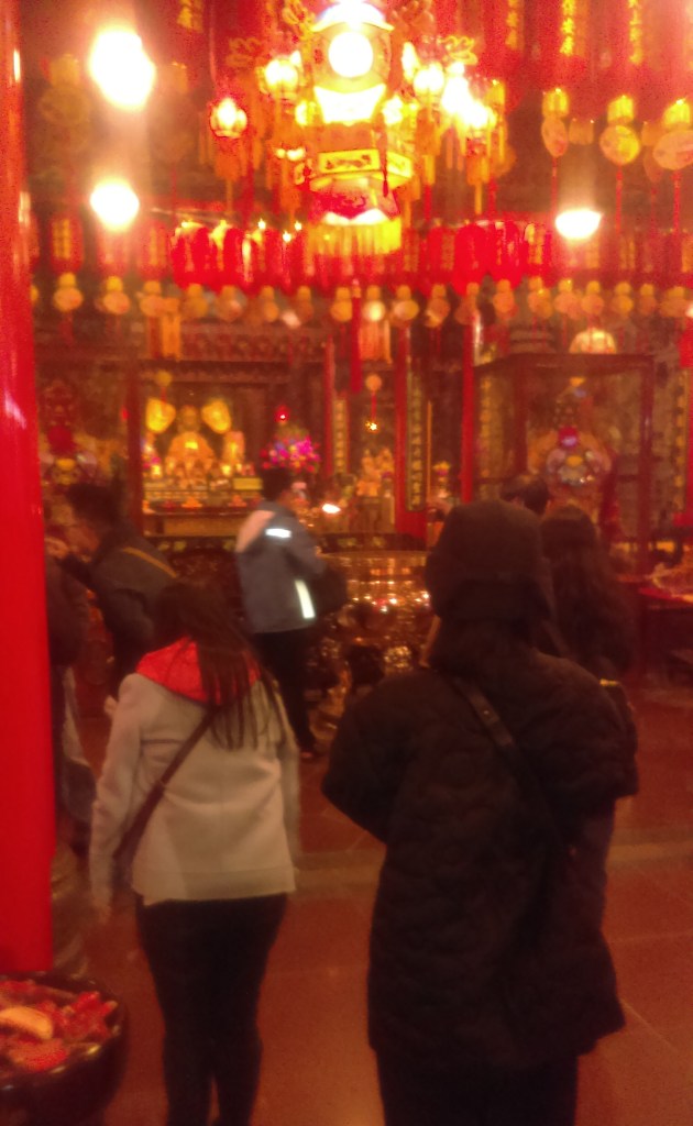There were more people in the Cíyòu Temple when I was there (above). According to Taiwan: Waves of Wonder, “This temple, built in the mid-18th century, is the cradle of development of the Songshan district. The story goes that a monk once roamed this area, carrying a gilded image of Mazu, Goddess of the Sea, as he begged for alms. One day at Xikou—the old name for this district—the monk came upon a number of people, all Mazu believers, from his old home. Together they planned construction of a temple to honor the goddess, and after raising funds for more than 10 years they were able to realize their dream. Construction started in 1753 and was completed in 1757.”