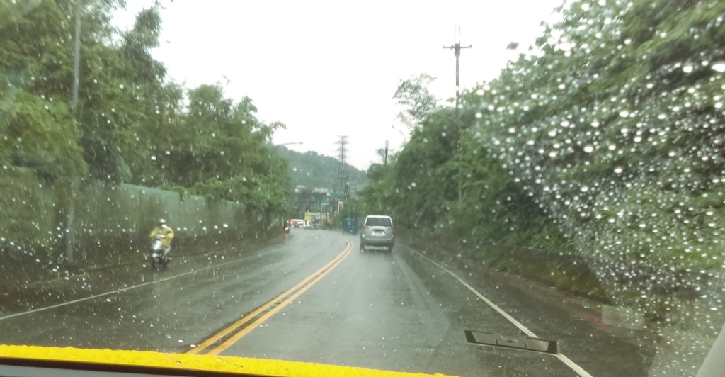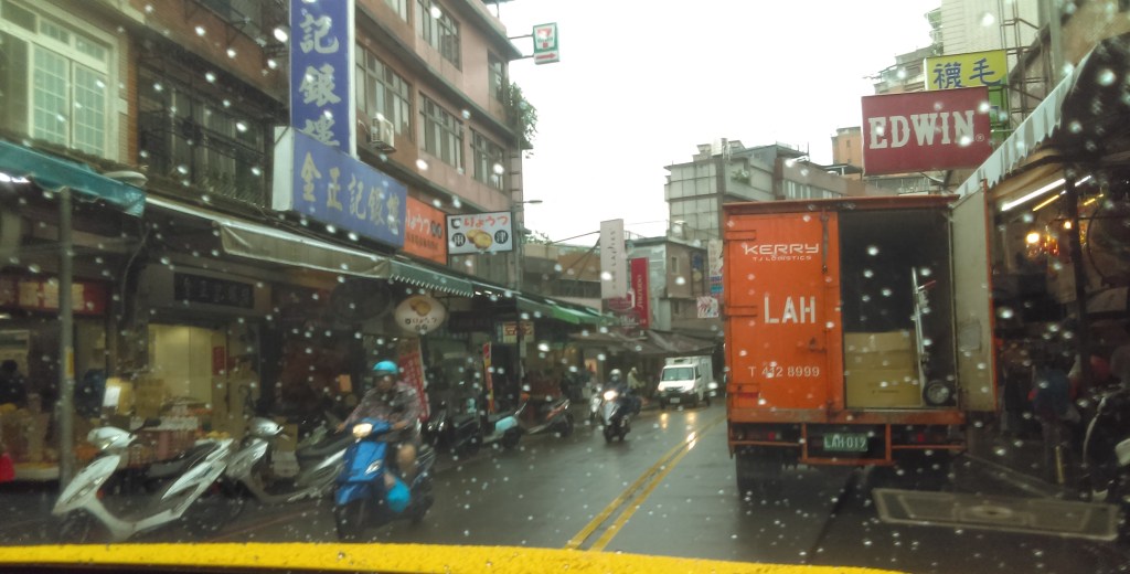 On leaving the terminal MRT station it was raining furiously, a real tropical downpour. The temperature was 23 degrees, cold for Taipei at this time of year. Outside I ran into three young men who I’d taken classes with before. I was going to get a taxi from the taxi rank nearby, so I offered to give them a lift free of change. They accepted, and one of them helped me climb into the taxi.
