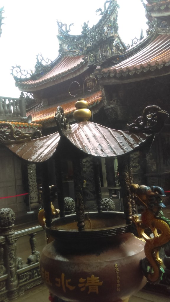 While I was waiting for the group I explored the temple (above). Travel to Taiwan (the Taiwan Tourist Administration website) says “Qingshui Zushi (Qingshui Master) Temple was built in 1769. The temple was destroyed by an earthquake in 1833 and was rebuilt in 1867. However, during 1895, it was burned down by the Japanese army. After World War II, the restoration was led by the renowned artist Li Mei Shu. The restored temple presents refined carvings and sculptures and it is the work of Taiwanese artists.”