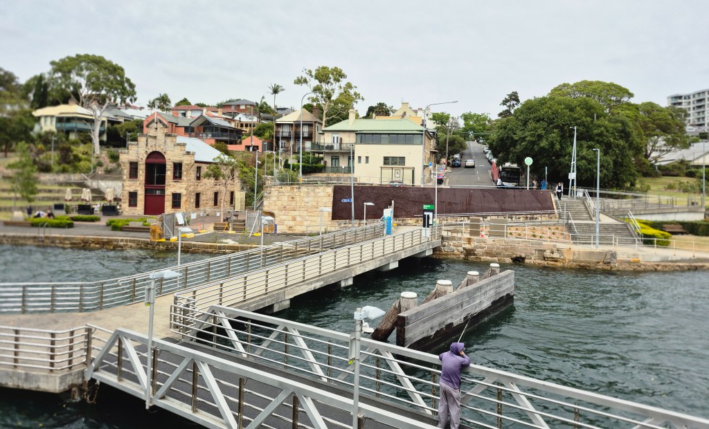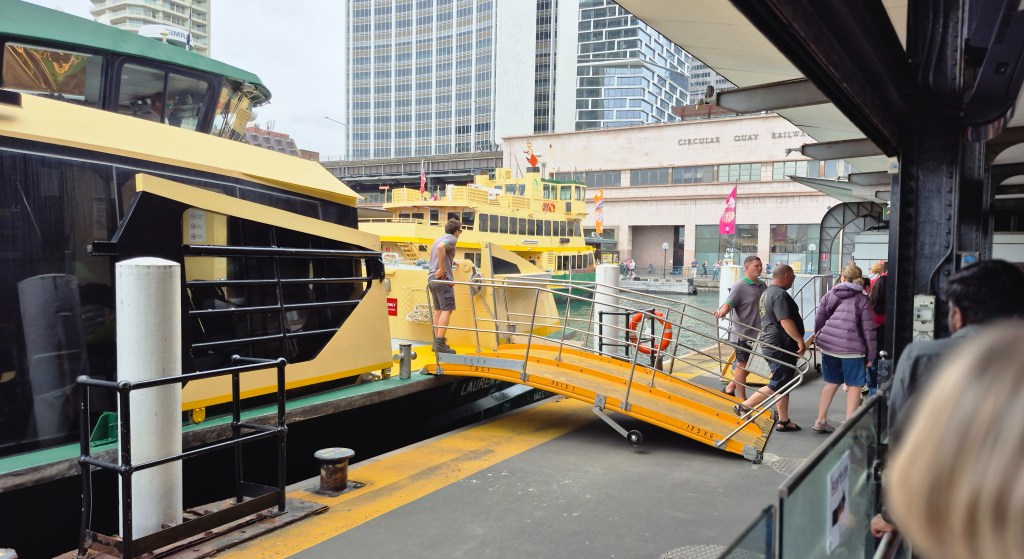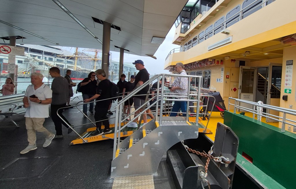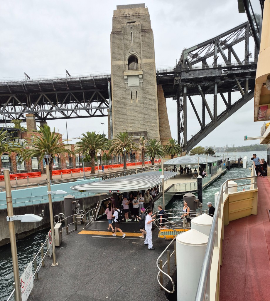 Passengers disembarking, the Sydney Harbour Bridge in the background.