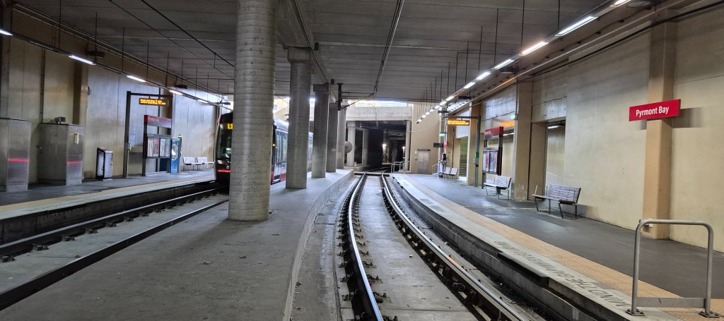 The light rail tracks were in cuttings and tunnels the whole way to the Fish Markets. Wikipedia says “Most of the alignment of the Dulwich Hill Line had its origins as the Rozelle–Darling Harbour Goods Line. … This line was extended to Dulwich Hill via the John Street tunnel, the Glebe tunnel, and Lilyfield in 1922. …With widespread use as a freight line throughout the early 20th century, the use of containers and the decentralisation of freight terminals in Sydney to places such as Port Botany and Chullora, Darling Harbour traffic was reduced considerably. The port closed and the area was redeveloped in the 1980s.”
