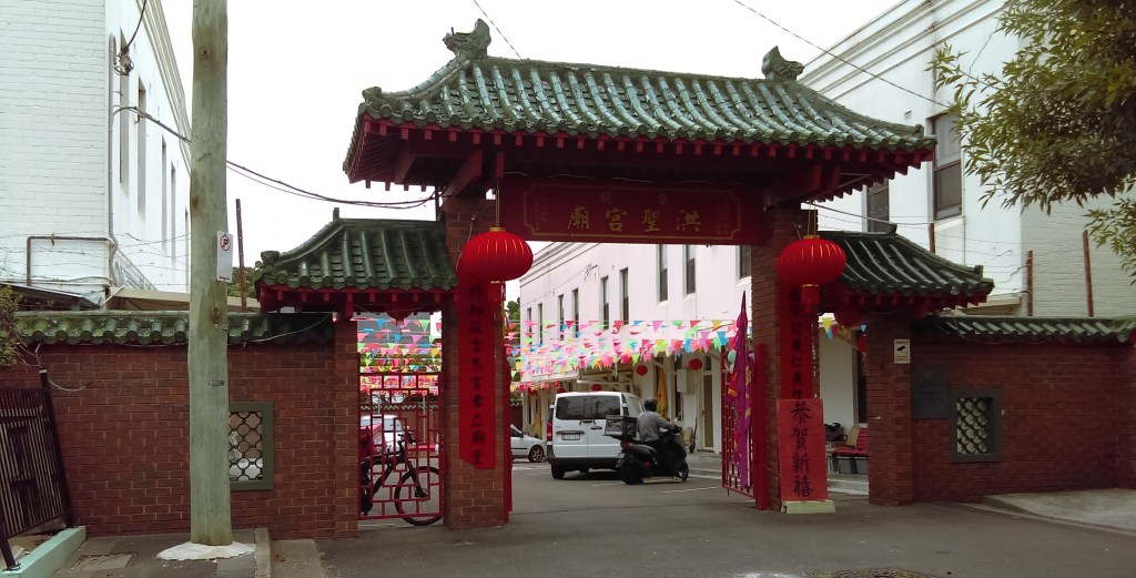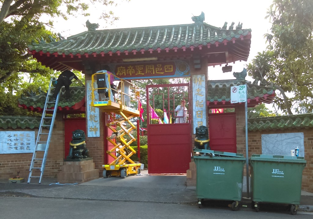 The gate of Sze Yup Temple, with people painting the gate. Wikipedia says 四邑關帝廟 means ‘the temple of Kwan Ti of the people of the Four Counties’. Sze Yup Temple was built from 1898 to 1904, is a Daoist temple, and “one of only four pre-World War I Chinese temples that remain active in Australia.” The name is in relation to the Sze Yup County in Guangdong Province, China.