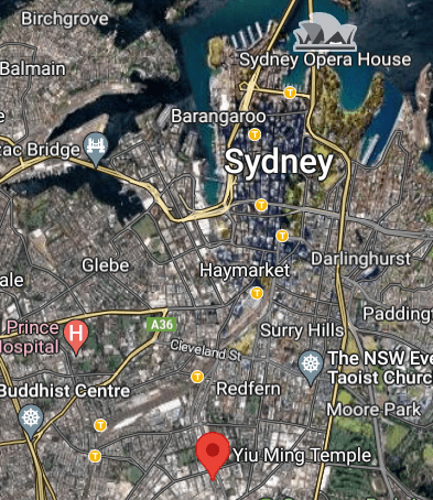 On an image of Google Maps the Sze Yup Temple is lower right. I used to live at Glebe Point many years ago, in Eglinton Road. To my surprise, the compound backs on to the rear of my ex-house. I could have thrown a stone out my kitchen over the lane and had it land on Sze Yup Temple land.