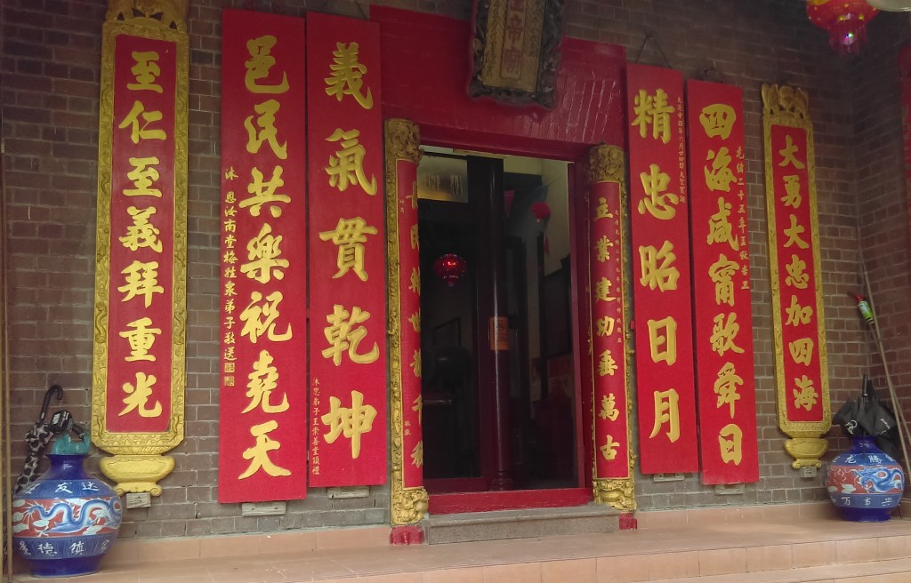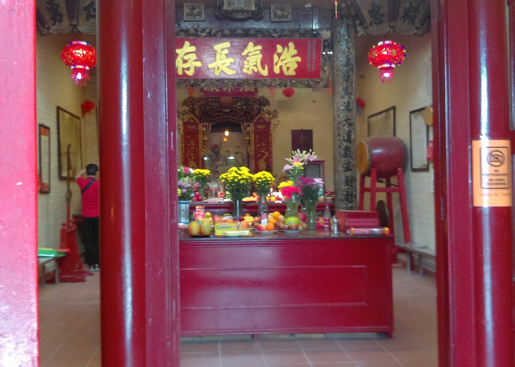 A photo at the entrance to the temple, showing fruit, a man worshiping on the extreme left, and on the back wall, a painting of Guan Di. Wikipedia says “The temple venerates Kwan Ti (Guan Di), a popular deity based on Guan Yu, a military figure of the Three Kingdoms Period. Its form, and those of the grounds, reflect the architectural style of Sze Yup counties (Siyi) in Guangdong, China.”