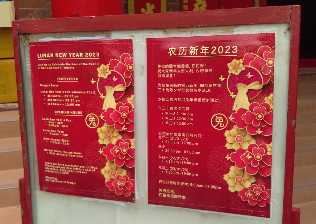Notices in English and simplified Chinese advertising a celebration on Lunar New Year Eve, January 21st.