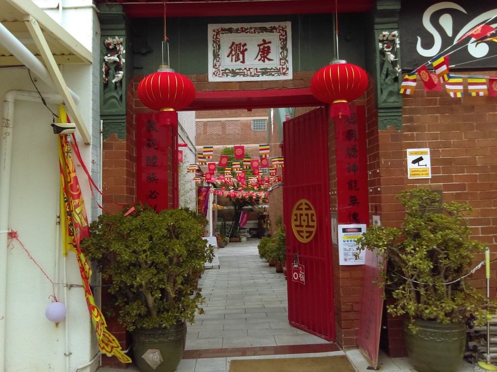 The gates of the Yiu Ming Temple, on Retreat Street only a few paces from busy Botany Road. Notice that the gate gives it’s actual name, 洪聖宮 (Hong Sheng Gong). “宮” means it’s a Daoist temple. Yiu Ming Temple is from the names of two villages that founded the temple in Guangdong province, China.