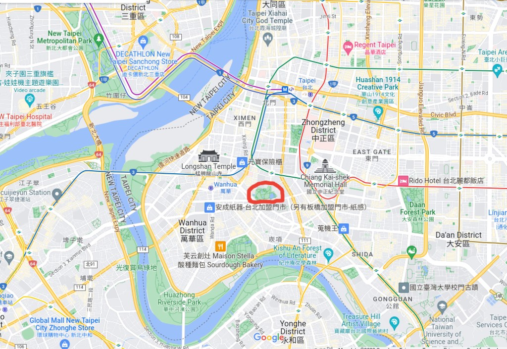 The above map shows the Taipei Botanical Garden circled in red, just to the west of the old city.