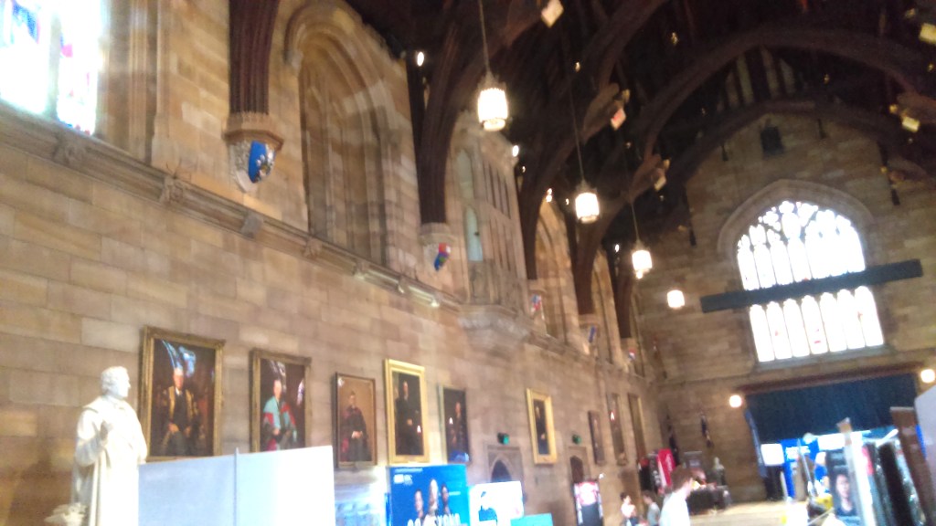 I went upstairs to MacLauren Hall, filled with booths advertising careers (above). It was very imposing, with the Gothic Revival architecture, hammerbeam roofs, and heavily decorated windows. SudentVIP says “Massive hall space used by the university for particularly prestigious lectures and seminars. Creepy, like a lot of the rooms in the Quad.”
