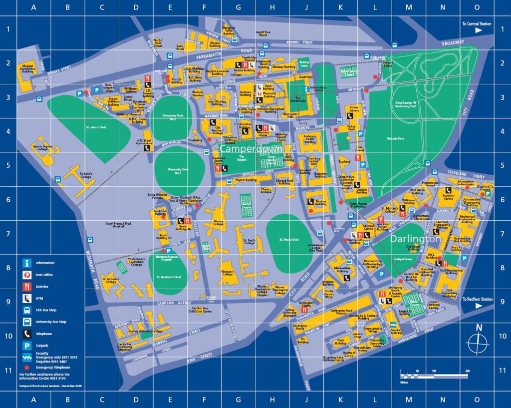 A plan of Sydney University itself. It shows Victoria Park, a green triangle on the upper left; the historic buildings to the right of Victoria Park; the colleges on the right filling up half the map; and the engineering quarter on the other side of City Road, marked “Darlington” on the plan.
