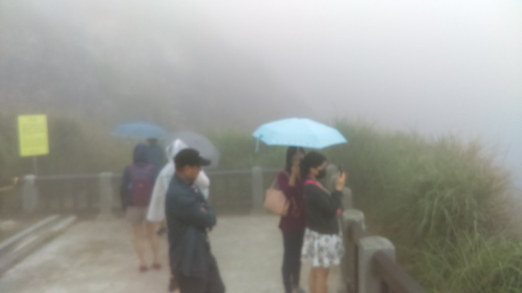 After lunch we went to Xiaoyoukeng (小油坑). The road went up into mist and light rain, with fog so thick that it bottled out the view. That isn’t trick photography in the above picture, it really was foggy!